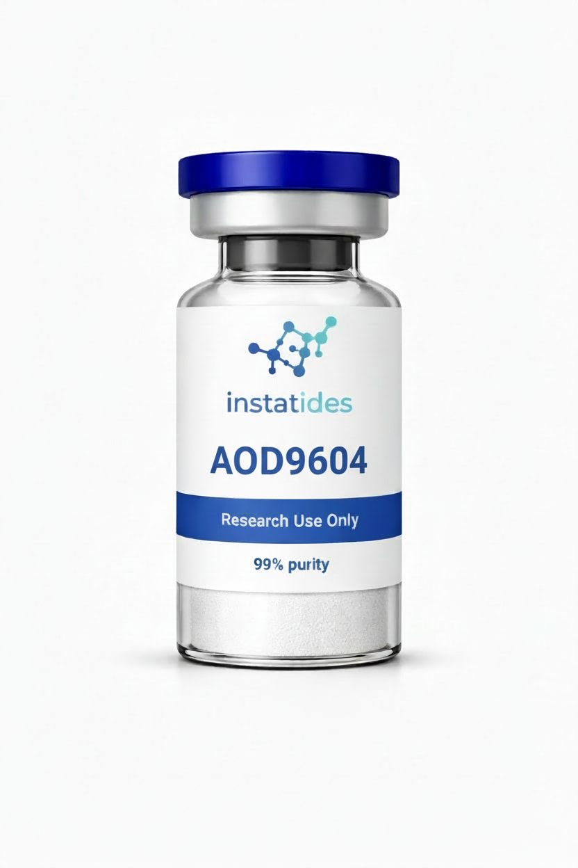 AOD-9604 — lyophilized powder. Available in 5mg. For laboratory and analytical research purposes only. Not for human or veterinary use. Not for consumption. Not intended to diagnose, treat, cure, or prevent any disease.