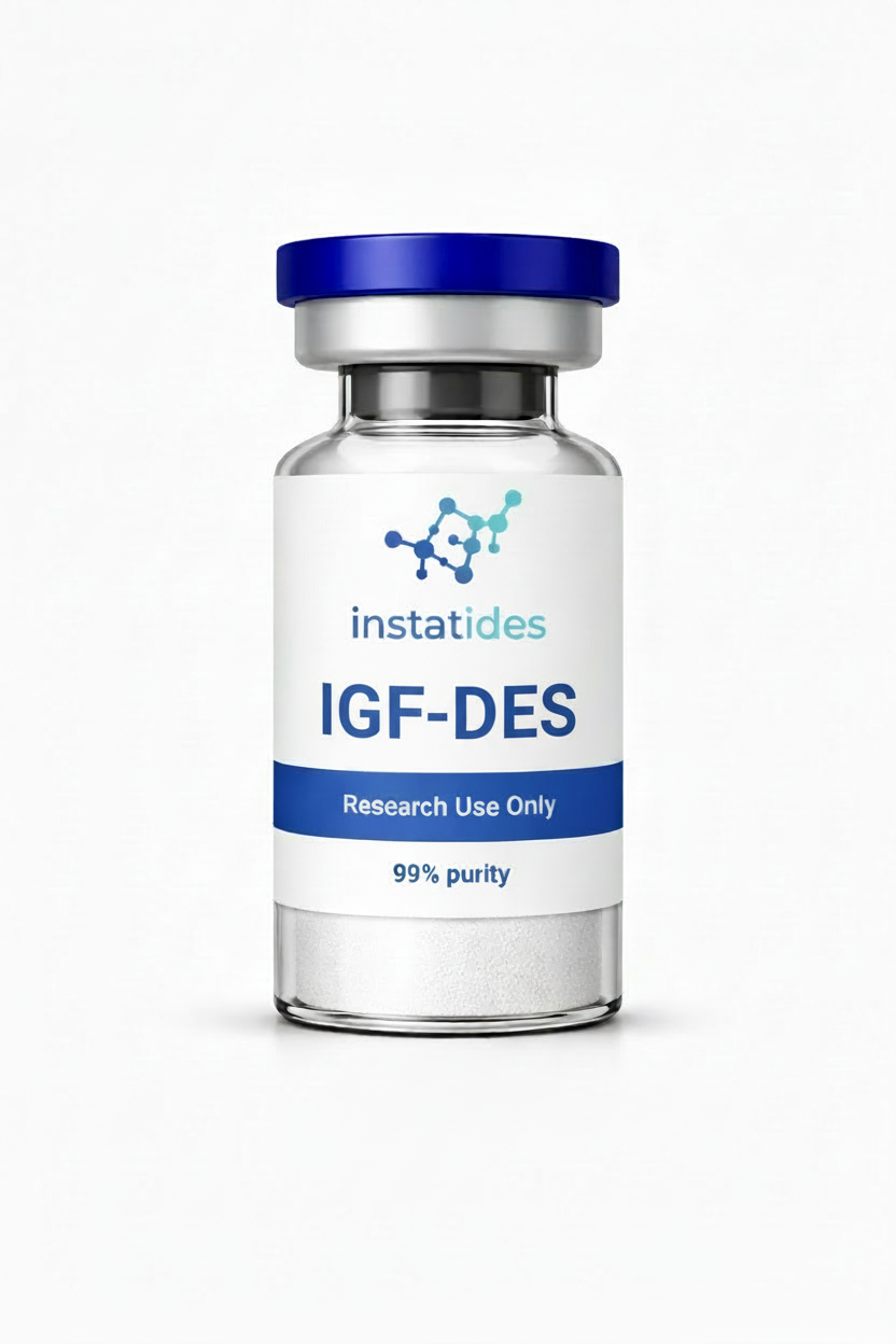 IGF-DES is a research-use-only compound supplied as lyophilized powder. Available strengths: 0.1mg. Category: GH & Secretagogues. For laboratory and analytical research purposes only. Not for human or veterinary use. Not for consumption. Not intended to diagnose, treat, cure, or prevent any disease.