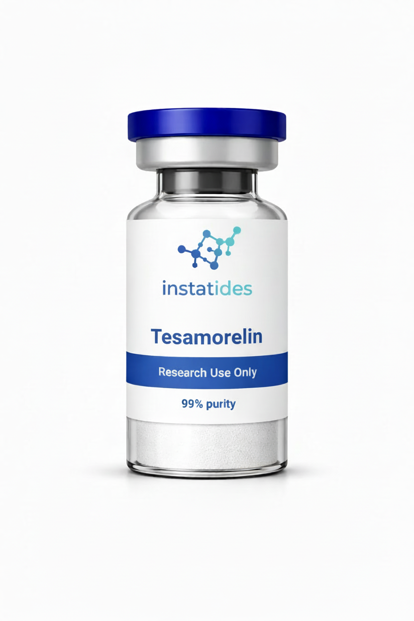 Tesamorelin is a research-use-only compound supplied as lyophilized powder. Available strengths: 5mg, 10mg. Category: GH & Secretagogues. For laboratory and analytical research purposes only. Not for human or veterinary use. Not for consumption. Not intended to diagnose, treat, cure, or prevent any disease.